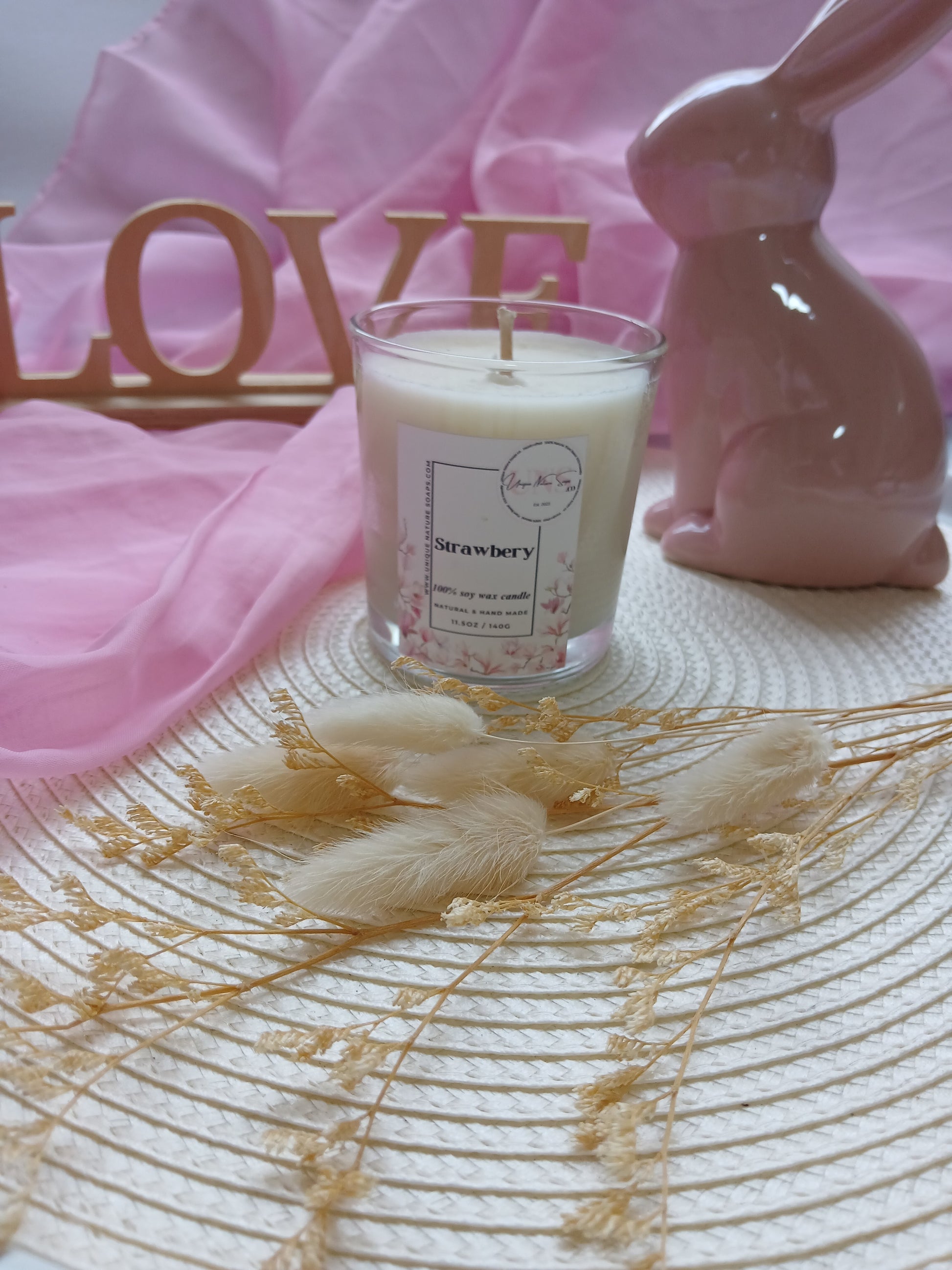 Soya wax, strawberry clean scent oil.